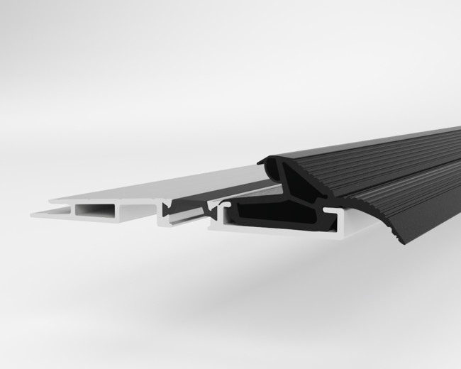Tillval till Original Alu Objekt och Harmoni utåtgående fönsterdörrar. Tröskel av aluminium med flexande gummidel som möjliggör enkel passage med rullstol eller rullator och samtidigt full täthet när dörren är stängd.