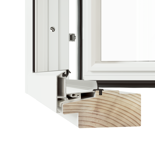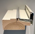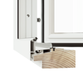 Harmoni inåtgående fönsterdörr erbjuds med två tröskelalternativ, här visas den högsta varianten. Tröskel i trä med utvändig del av aluminium, höjd 74 mm.