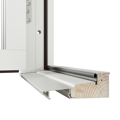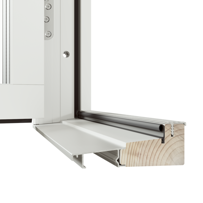 Original Alu Altan- och Fönsterdörr erbjuds med tre tröskelalternativ, här visas den högsta varianten. Tröskel i trä med utvändig del av aluminium, höjd 42 mm.